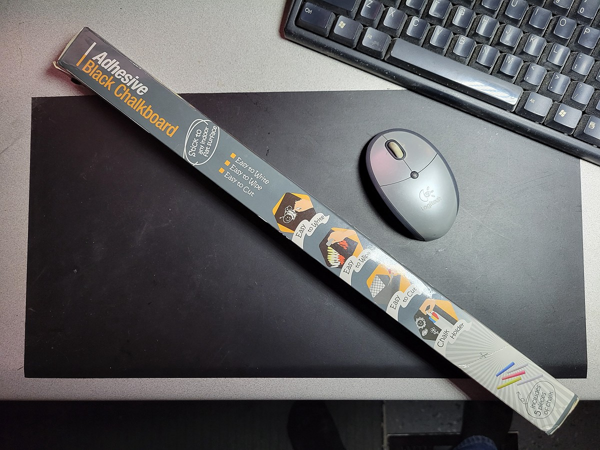 A roll of Self Adhesive Chalkboard Material has plenty of uses. I use a piece on my desk for a mouse pad that I can take notes on. I like the texture and the look and will be covering the entire top of the new roll top desk with it.